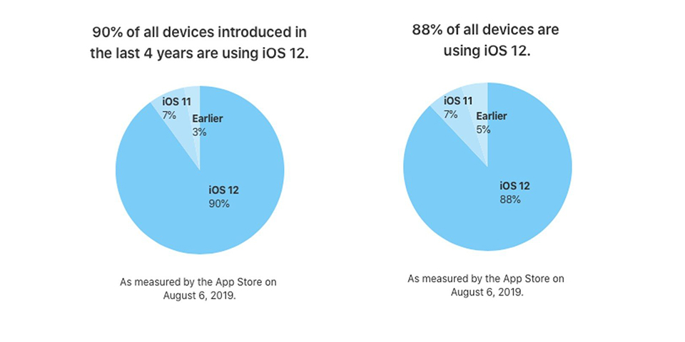 Theo báo cáo ngày hôm nay, 88% iPhone và iPad của người dùng đã cập nhật lên hệ điều hành iOS 12. Con số này sẽ tăng lên 90% nếu chỉ tính các thiết bị được phát hành trong vòng 4 năm trở lại đây. Thông tin này được thống kê trước khi “Nhà táo” tung ra phiên bản hệ điều hành iOS 13 chính thức cùng thế hệ iPhone 11 vào tháng 9 tới đây.