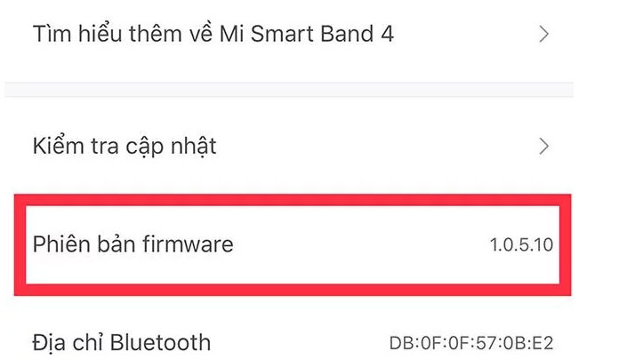 Nếu vẫn chưa hiển thị tiếng Việt thì hãy kiểm tra phiên bản Firmware trên Miband 4 xem đã là 1.0.5.10 hay chưa. Nếu chưa bạn cần tiến hành cập nhật để có được ngôn ngữ tiếng Việt trên Mi Band 4.