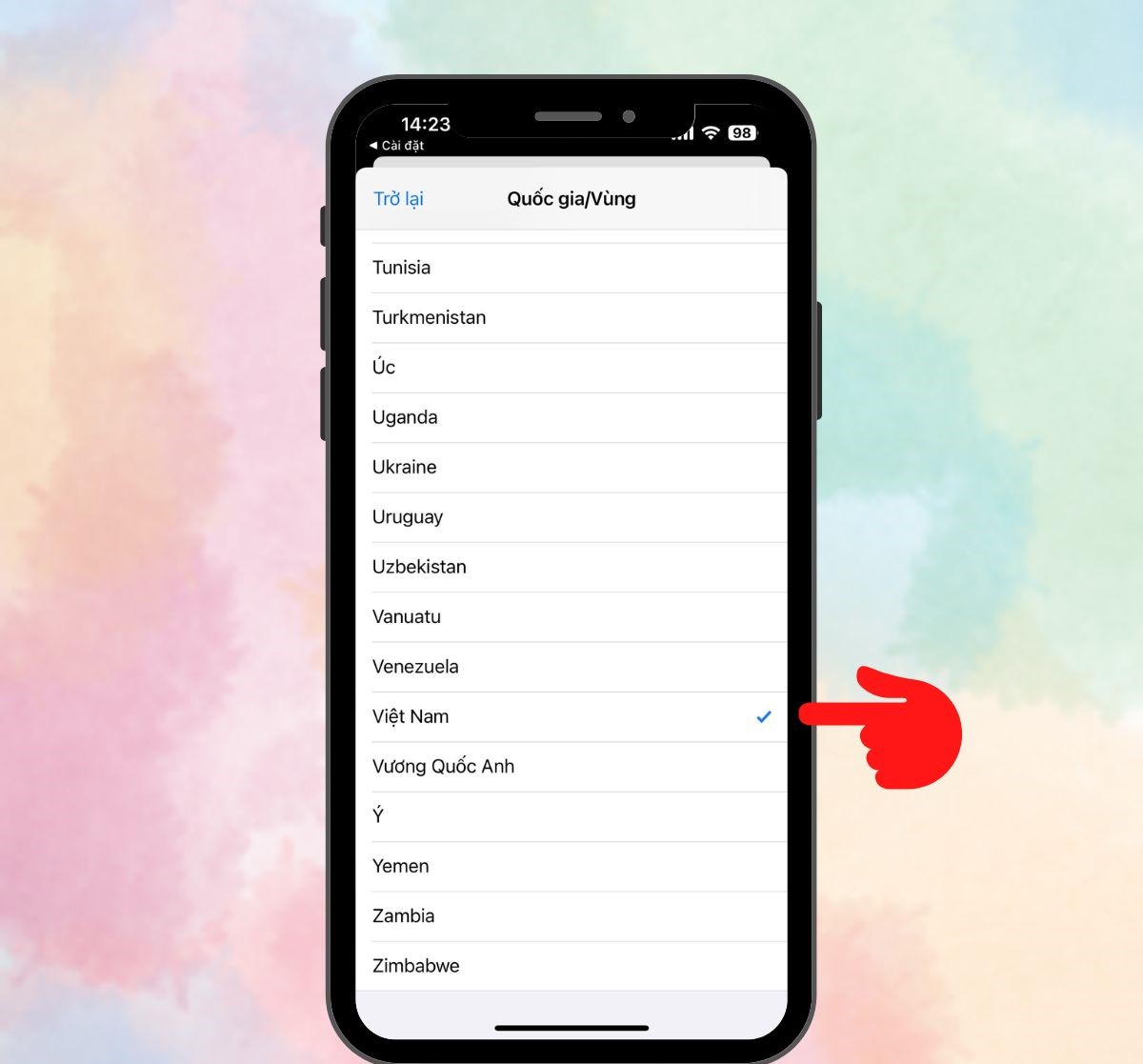 Chọn quốc gia bạn muốn (ví dụ: Việt Nam nếu muốn chuyển sang tiếng Việt)