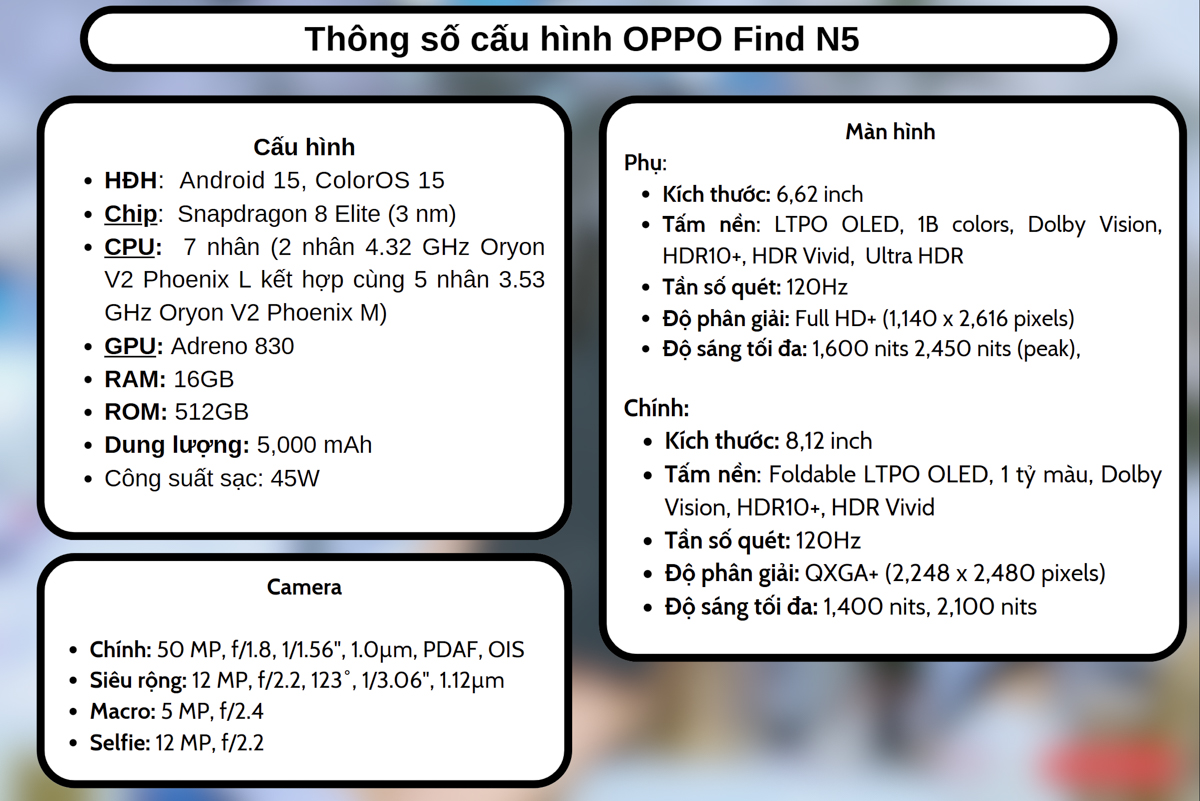 OPPO Find N5 được trang bị viên pin silicon-carbon dung lượng 5.600mAh, đây là con số nổi bật nhất hiện tại trong dòng smartphone gập. Nhờ công nghệ pin mới, thiết bị duy trì độ mỏng ấn tượng nhưng vẫn cung cấp năng lượng dồi dào cho người dùng.