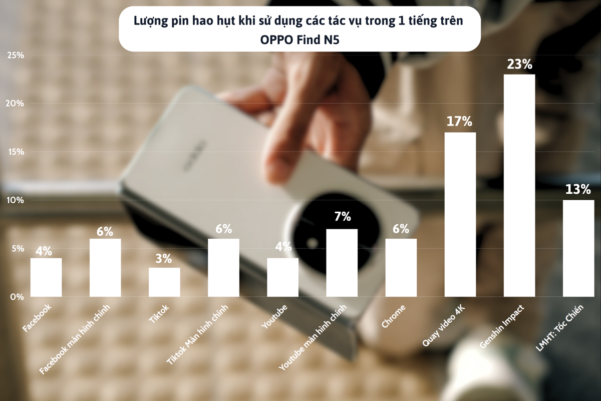 Trong các bài test thực tế, OPPO Find N5 cho thấy khả năng tiết kiệm năng lượng rất tốt. Với các tác vụ phổ thông như lướt web, xem YouTube, chụp ảnh và chơi game nhẹ, máy chỉ mất khoảng 30-35% pin sau 3 giờ sử dụng liên tục.