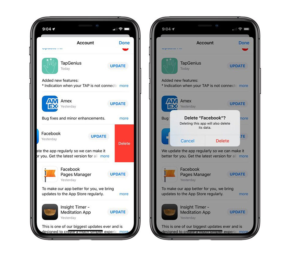 Cụ thể, trên 2 hệ điều hành di động mới của Apple, khi bạn đang cập nhật ứng dụng trên điện thoại hoặc xem các ứng dụng được cập nhật gần đây, bạn có thể vuốt sang trái trên bất kỳ ứng dụng nào trong danh sách để hiển thị tùy chọn “Delete”. Chạm vào nút này sẽ hiển thị giao diện xóa ứng dụng tiêu chuẩn, nơi bạn có thể xác nhận xóa ứng dụng ngay lập tức.