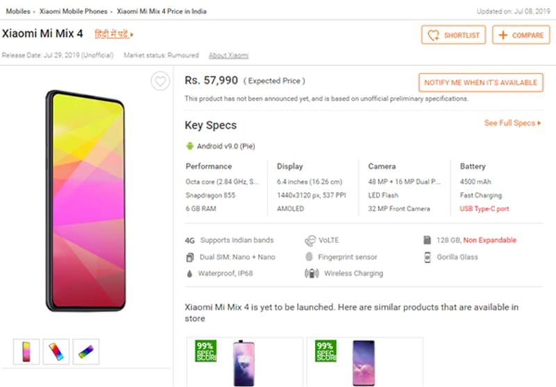 Chưa hết, mẫu flagship sắp ra mắt của Xiaomi còn được cho là sẽ sở hữu hệ thống camera sau kép 48MP + 16MP, trong khi ở mặt trước của máy có sự xuất hiện của camera selfie 32MP để người dùng chụp ảnh “tự sướng” và gọi video call. Cuối cùng, Mi MIX 4 được liệt kê có pin dung lượng 4,500 mAh hỗ trợ sạc nhanh và đi kèm giá bán 57,990 INR (khoảng 19.67 triệu đồng).