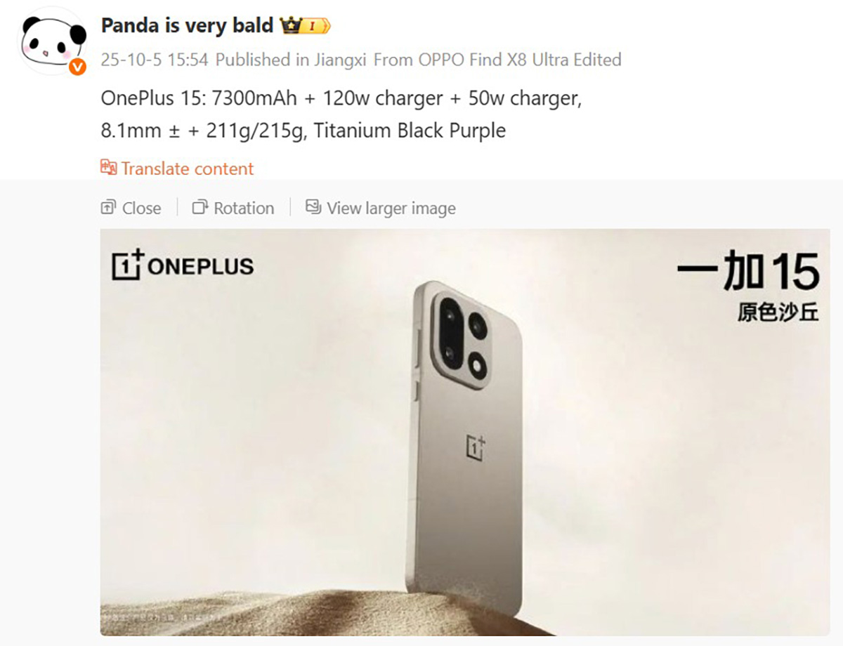 Nguồn rò rỉ từ leaker Bald Panda cho biết OnePlus 15 sẽ trang bị viên pin 7.300 mAh — lớn nhất từng được trang bị trên dòng máy OnePlus.