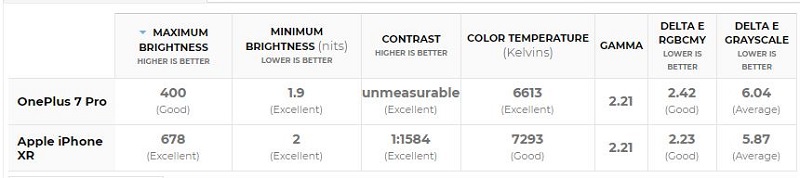Bảng so sánh chất lượng hiển thị giữa OnePlus 7 Pro và Apple iPhone XR