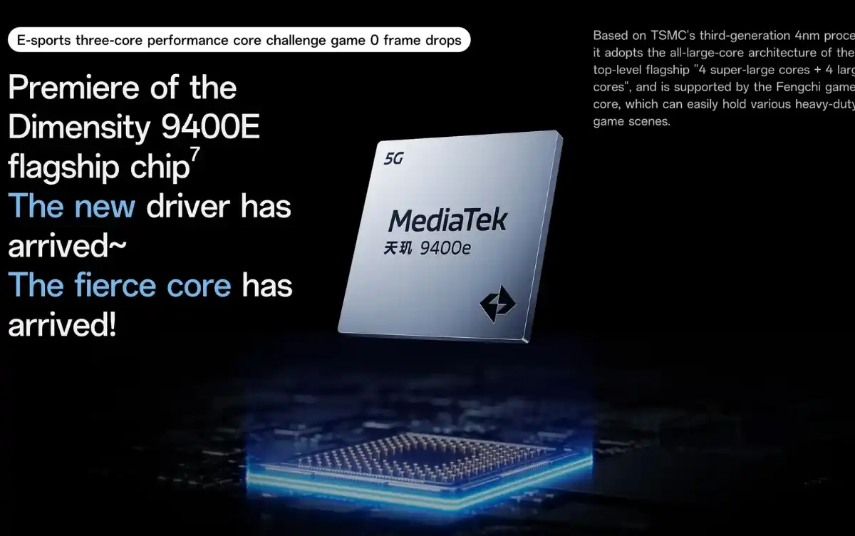 Chipset: MediaTek Dimensity 9400e (4 nm) – gồm 8 nhân Cortex-X4 và A720, GPU Mali‑G720 Immortalis MP12, NPU MediaTek NPU 790, xung nhịp tối đa 3.4 GHz