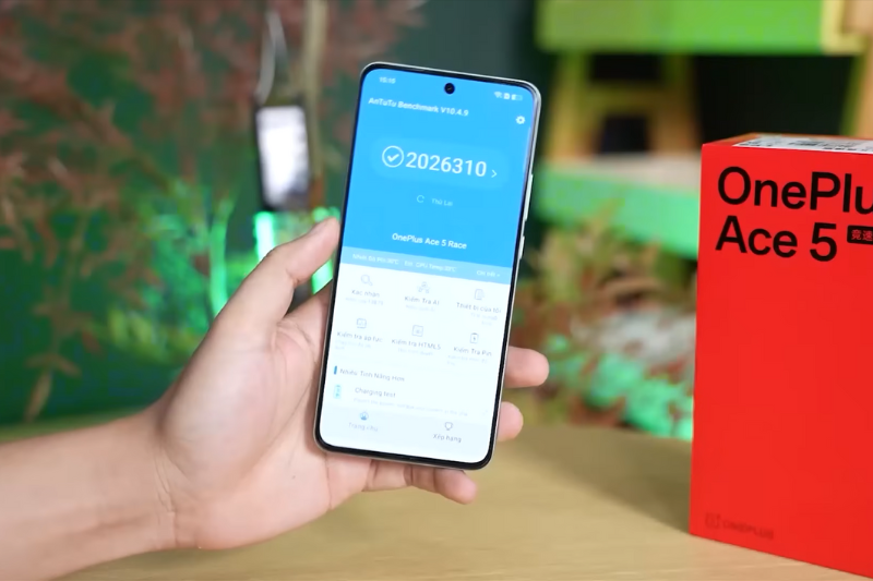 Sự kết hợp giữa Dimensity 9400e, RAM LPDDR5X và tản nhiệt buồng hơi kép giúp Ace 5 Racing xử lý dễ dàng các tựa game như Genshin Impact, PUBG Mobile hay Liên Quân ở mức đồ họa cao. Theo đánh giá từ NanoReview thì máy đạt điểm AnTuTu gần 2.12 triệu điểm, hiệu năng chơi game ổn định, nhiệt độ được kiểm soát tốt trong thời gian dài