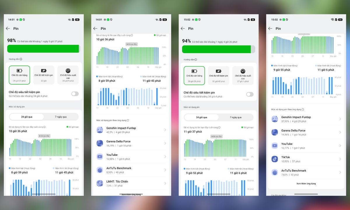 Trong các tác vụ nhẹ hơn (lướt web, mạng xã hội) thì mức tiêu hao rất thấp — ví dụ 3 tiếng đầu chỉ giảm ~9%.