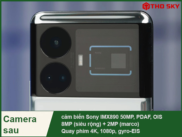 Cảm biến Sony IMX890 50MP đóng vai trò là ống kính chính, hỗ trợ các tính năng PDAF và chống rung quang học OIS. Kết hợp với camera góc siêu rộng 8MP và một ống kính macro 2MP. Máy có khả năng quay phim 4K@30/60fps, 1080p@30/60fps với khả năng hỗ trợ gyro-EIS.