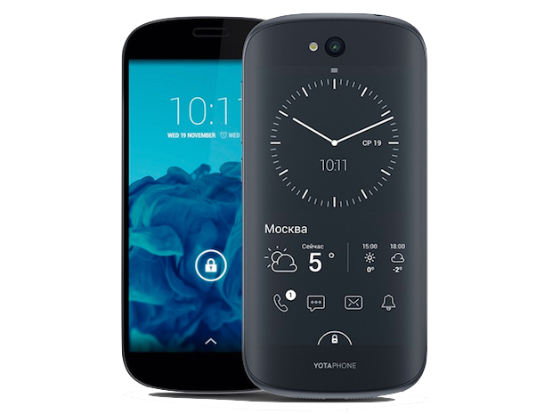 Với chiếc YotaPhone, nhà sản xuất trang bị cho thiết bị này 2 màn hình, bao gồm 1 màn hình LCD hoặc AMOLED chính, trong khi đó màn hình phụ ở mặt sau sẽ chỉ là màn hình E-ink. Màn hình E-ink giúp máy giảm thiểu tối đa điện năng tiêu thụ. YotaPhone lần đầu được công bố vào năm 2013, tức là 4 năm trước khi Samsung đệ trình sáng chế đầu tiên về thiết bị smartphone màn hình kép.