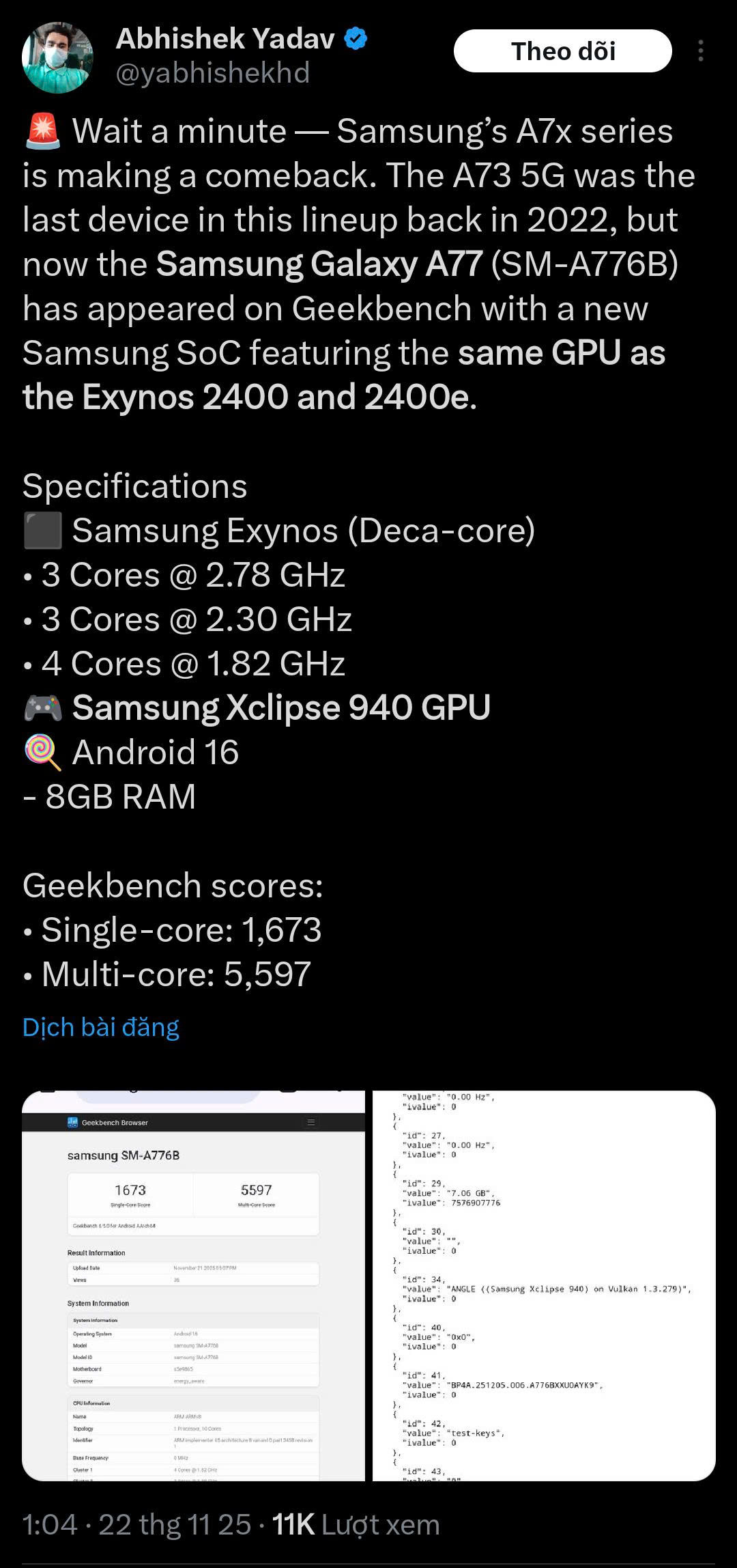 Theo các thông tin rò rỉ mới nhất, Samsung Galaxy A77 (mã máy SM-A776B) đã xuất hiện trên cơ sở dữ liệu Geekbench, điều này hé lộ việc dòng A7x của Samsung có thể được hồi sinh sau một thời gian vắng bóng.