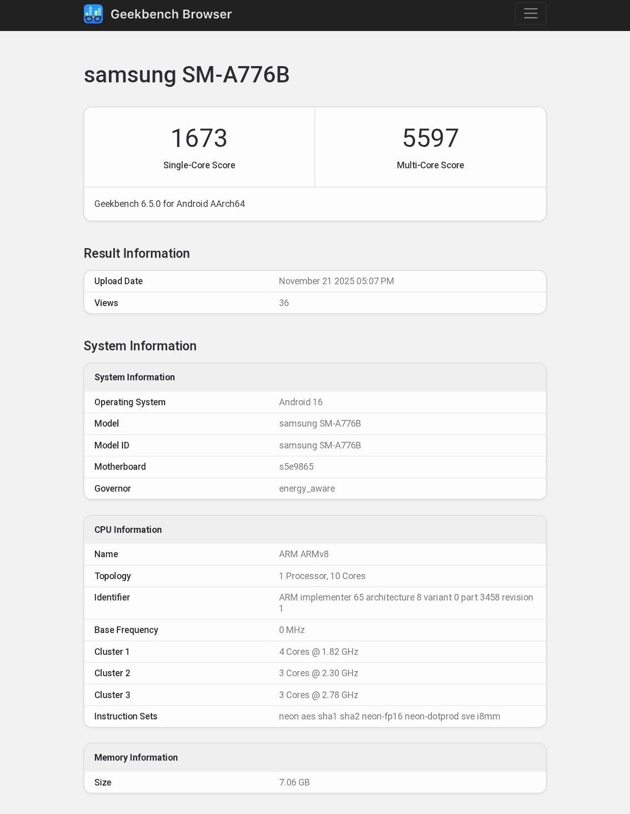 Điểm benchmark từ Geekbench 6 cho thấy máy đạt khoảng 1.673 điểm đơn nhân và 5.697 điểm đa nhân, vượt khoảng 45% so với chip Exynos 1580 trên mẫu Galaxy A56 hiện tại