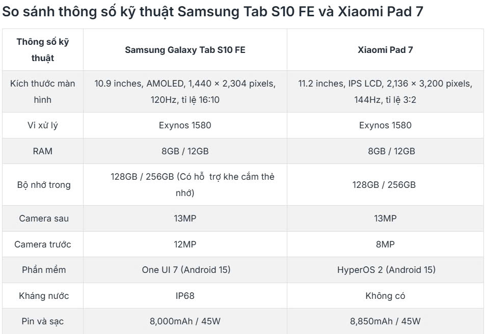 Trong phân khúc máy tính bảng tầm trung, hai cái tên nổi bật là Samsung Galaxy Tab S10 FE và Xiaomi Pad 7. Cả hai đều mang đến những tính năng hấp dẫn, phục vụ tốt cho nhu cầu học tập, làm việc và giải trí. Bài viết này sẽ giúp bạn so sánh chi tiết giữa hai thiết bị để đưa ra lựa chọn phù hợp