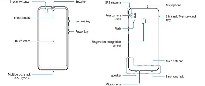 Theo tài liệu hướng dẫn sử dụng, tin vui là Galaxy M10s đã được tích hợp cổng USB-C, camera kép sau chưa rõ thông số, cảm biến vân tay ở mặt lưng, cổng cắm tai nghe 3.5mm và viên pin 4.000 mAh.