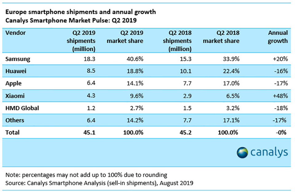 Ở vị trí thứ tư và thứ năm thuộc về Xiaomi và HMD Global. Tuy nhiên, nếu như Xiaomi tăng tới 48% thì HMD – đơn vị quản lý nhãn hiệu Nokia – lại giảm 18% so với cùng kỳ năm ngoái. Với toàn thị trường châu Âu, quý II vừa qua ghi nhận sự giảm nhẹ xuống còn 45.1 triệu chiếc so với 45.2 triệu của cùng kỳ năm ngoái.