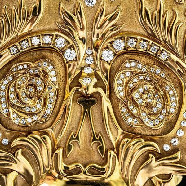 Chiếc đầu lâu độc đáo này được làm từ 110 gram vàng 18k và được “trang trí” bởi những viên kim cương lấp lánh. Tổng cộng có khoảng 137 viên đá quý được đính lên mặt lưng làm từ da cá sấu cao cấp.