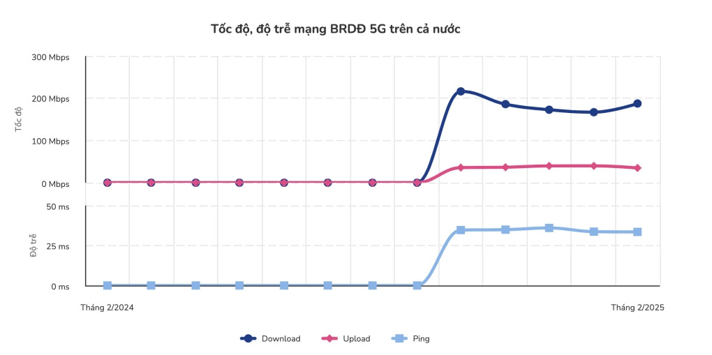 Theo số liệu từ i-Speed, tính đến tháng 2/2025, tốc độ tải xuống trung bình của mạng 5G tại Việt Nam đạt 187,58 Mbps, trong khi tốc độ tải lên là 34,87 Mbps. So với mạng 4G, tốc độ tải xuống trung bình chỉ đạt 65,61 Mbps, cho thấy 5G mang lại tốc độ cao hơn đáng kể.