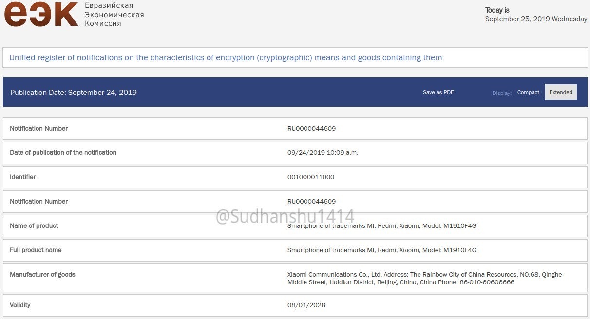 Các báo cáo mới đây đã tiết lộ Xiaomi đang lên kế hoạch cho ra mắt một phiên bản Pro nâng cấp của chiếc Xiaomi CC9 có tên Xiaomi CC9 Pro với điểm nhấn tới từ camera chính 108MP. Mặc dù chưa có bất kỳ thông tin nào xác nhận về chiếc Xiaomi CC9 Pro này, tuy nhiên mới đây, một thiết bị Xiaomi bí ẩn có tên mã M1910F4G đã xuất hiện trên trang chứng nhận EEC của châu Âu, được cho chính là chiếc Xiaomi CC9 Pro.