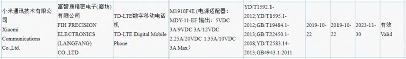 Mi CC9 Pro dự kiến có tên model là M1910M4E, smartphone này vừa được chứng nhận tại cơ quan 3C Trung Quốc và cơ quan này xác nhận máy đi kèm với sạc nhanh 30W. Trong khi đó, một model khác là M1910M4G cũng đã được Ủy ban Kinh tế Á-Âu chứng nhận.