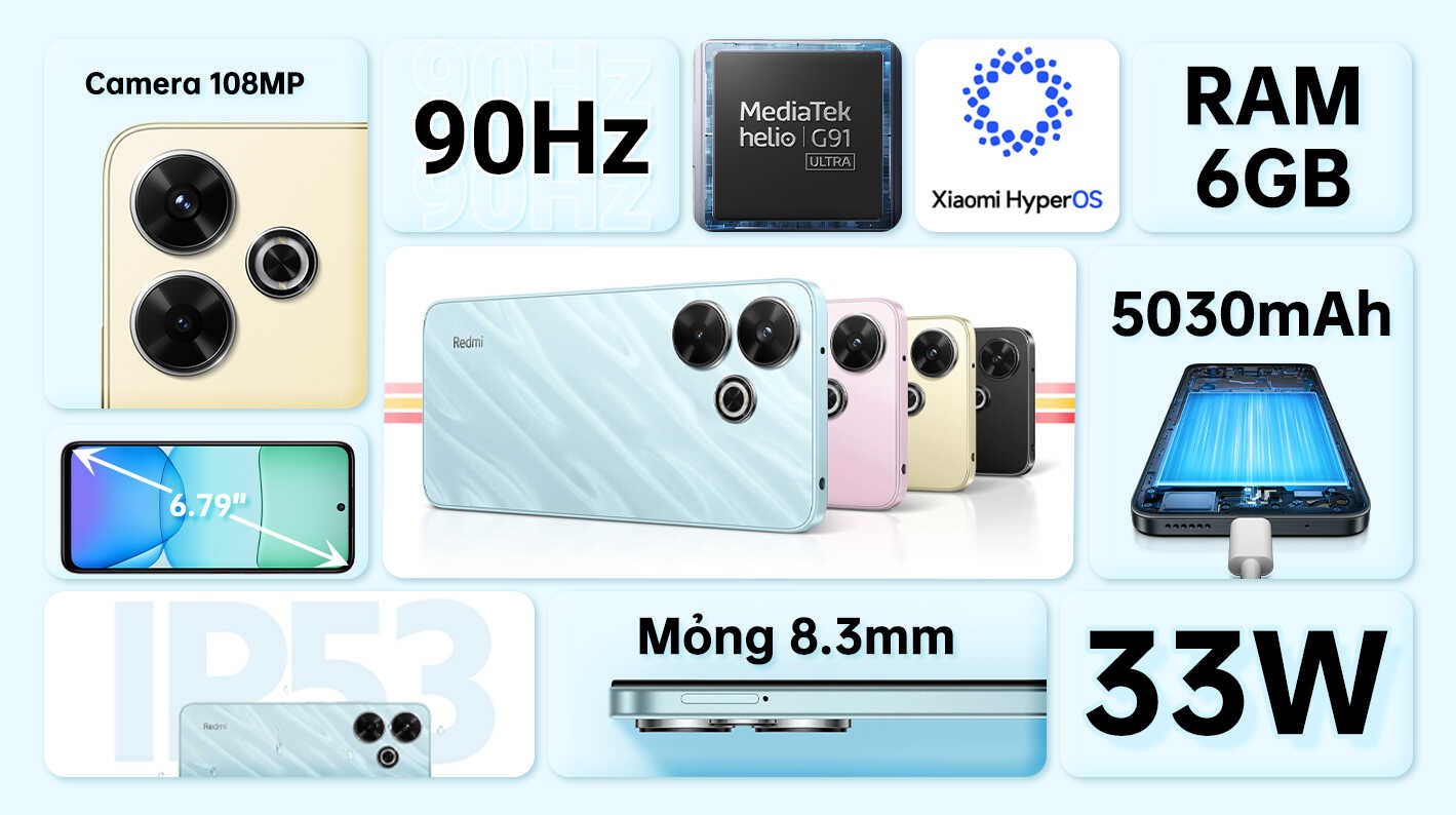 Redmi 13 được trang bị màn hình IPS LCD 6.79 inch với độ phân giải Full HD+ (1080 x 2460 pixels), mang đến hình ảnh sắc nét và chi tiết. Tần số quét 90Hz giúp trải nghiệm lướt web, xem video và chơi game trở nên mượt mà hơn. Màn hình còn được bảo vệ bởi kính cường lực Corning Gorilla Glass 3 và hỗ trợ kháng bụi, nước theo tiêu chuẩn IP53
